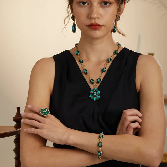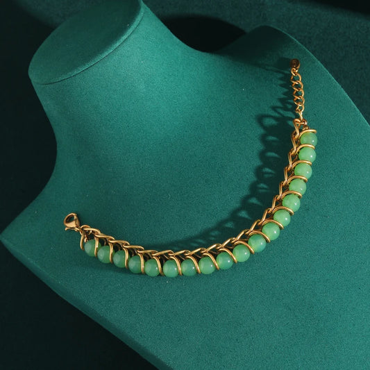 Women Vintage Gold Color Chain Green Beaded Designer Charms Antique Bracelets