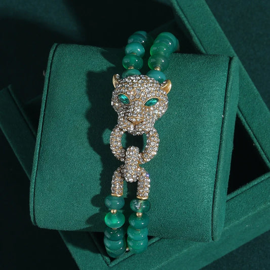Vintage Green Beads Women Rhinestones Leopard Head Bangles Eye Bracelets