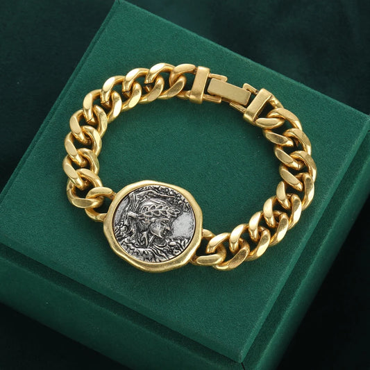 Vintage Copper Beauty Portrait Ancient Round Coin Wide Chain Women Bracelet