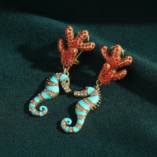 Vintage Antique Women Coral Seahorse Enamel Natural Stone Drop Earrings