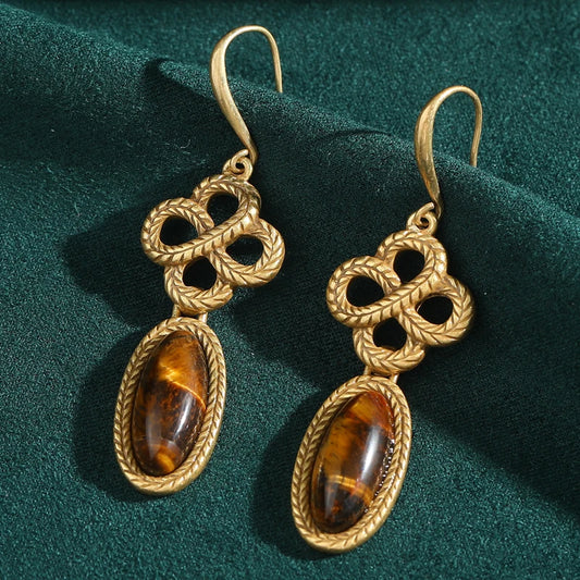 Vintage Long Oval Tiger Eye Natural Stone Lucky Flower Knot 18k Gold Color Antique Drop Dangle Earrings