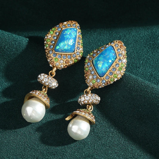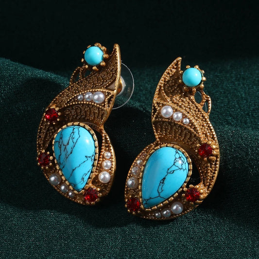Antique Luxury Water Drop Natural Stone Goldfish Blue Long Charm Vintage Stud Earrings