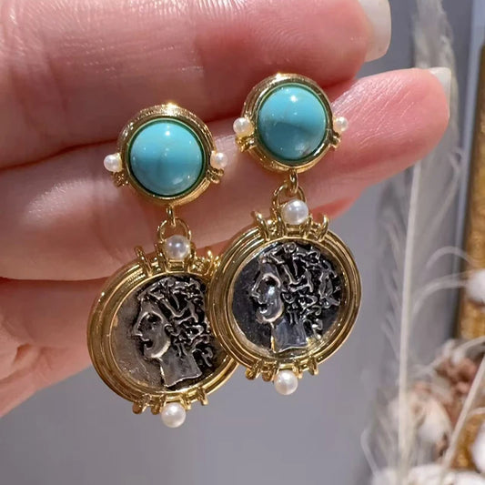 Vintage Natural Stone Blue Turquoise Round Palace Antique Gold Color Designer Drop Earrings
