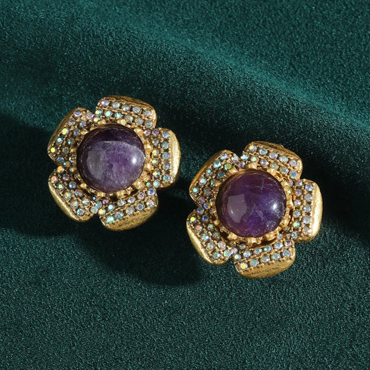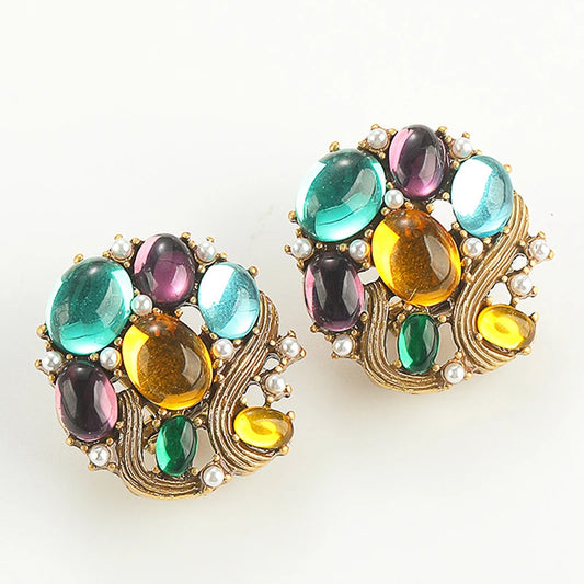 Vintage Colorful Stone Glass Grape Round Gothic Antique Luxury Designer Stud Crystal Earrings