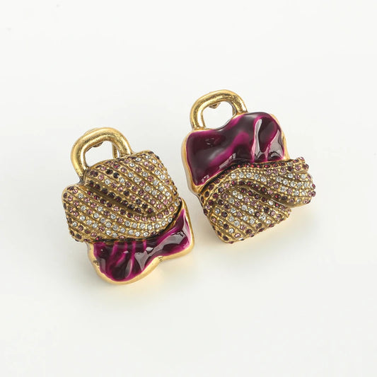 Women Purple Handbag w/ Asymmetrical Rhinestones Inlay Gold Color Earrings