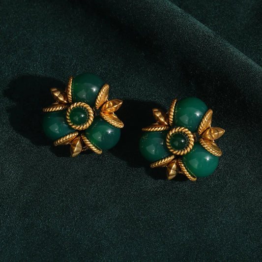 Vintage Emerald Green Natural Stone Three Ball Gold Color Leaf Antique Stud Earrings