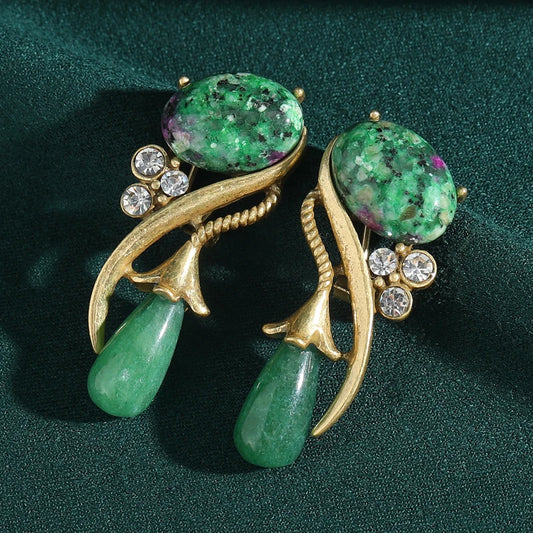 Antique Moss Green Natural Stone Flower Rhinestones Vintage Long Water Drop Earrings