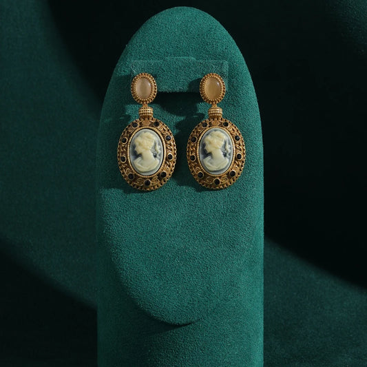Antique Camelot Relief Portrait Beautiful Women Oval Natural Stone Gold Color Vintage Drop Earrings