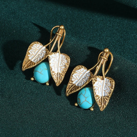 Vintage Turquoise Blue Natural Stone Antique 18k Gold Color Leaf Designer Stud Earrings