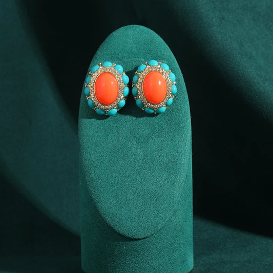 Women Egg Shape Natural Stone Vintage Gold Color Wedding Stud Earrings