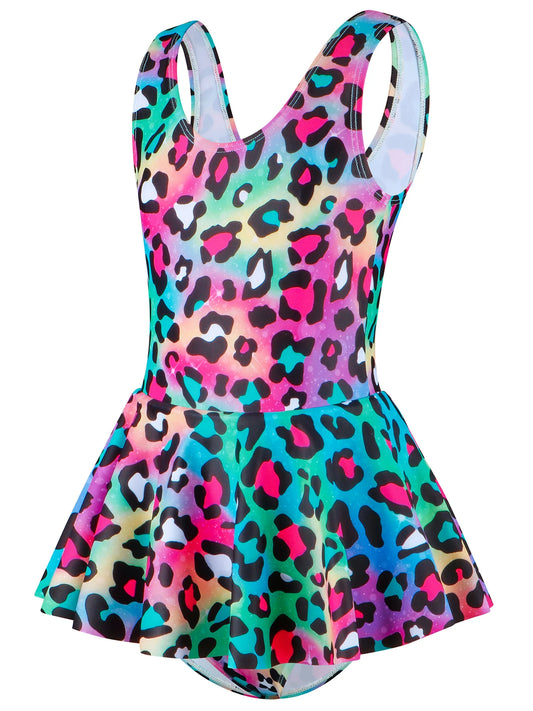 Girls Kids Sleeveless Tank Sleeve Scoop Collar Beach Leopard Pattern Skirted Bikini Briefs Swimming Suit