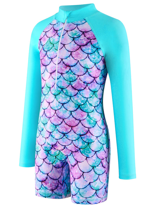 Kids Girls Long Raglan Sleeve Scale Print Zipper Boyleg Shorts Swimwear Beach Swimsuit