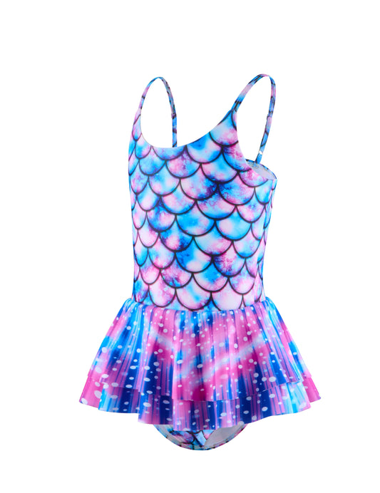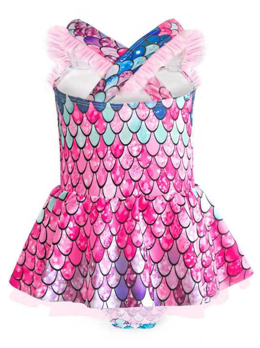 Kids Girl Thin Strap Backless Mermaid Scale Printed Double Layers Bikini Cut Swimwear
