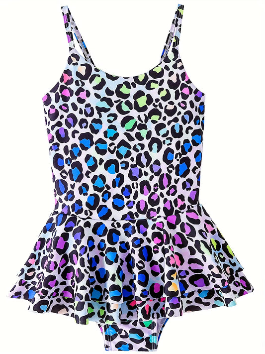 Kids Girl Sleeveless All-Over Leopard Pattern Print Backless Skirted Bikini Briefs Swimwear