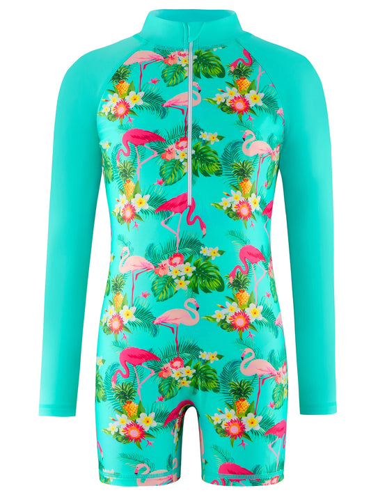 One-Piece Kids Girls Cyan Color Long-Sleeved Flamingo Print Suit Boyleg Shorts Swimwear