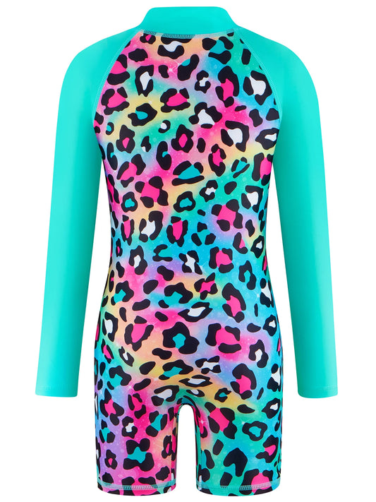 Kids Girls One-Piece Long Sleeve Leopard Pattern Print Rash Guard Boyleg Shorts Swimwear