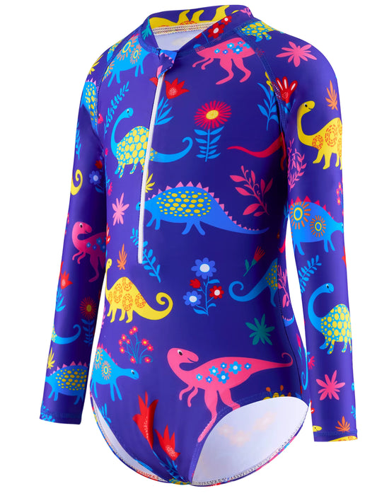 Kids Girl One-Piece Long Sleeve Dinosaur Print Beach Rash Guard Bikini Cut Bottom Swimming Suit