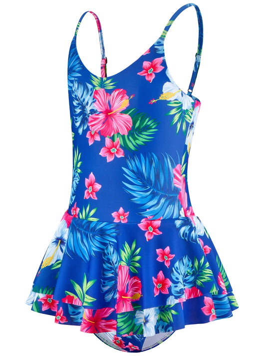 Girls Kids One-Piece Sleeveless Blue Pink Floral Print Swimwear Beach Skirted Bikini Briefs