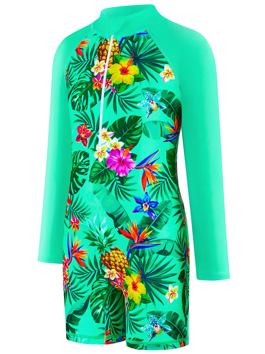 Kids Girls Quick-Dry Long-Sleeved Floral Print Closure Boyleg Shorts Swimming Suit