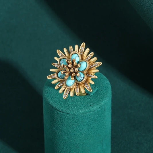 Luxury 18k Gold Color Crushed Arrow Natural Stone Flower Vintage Antique Designer Open Ring