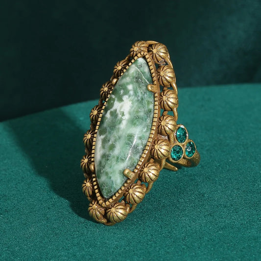 Vintage Green Natural Stone Olive Shape Antique 18K Gold Color Luxury Ring
