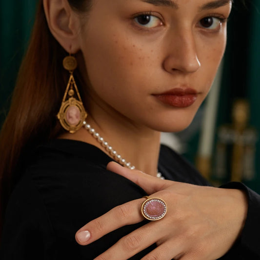 Women Vintage Cameo Pink Oval Beauty White Rhinestone French Gold Color Ring