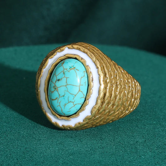 Women Vintage Turquoise Oval Blue Natural Stone Antique 18k Gold Color Hammer Pattern Designer Ring