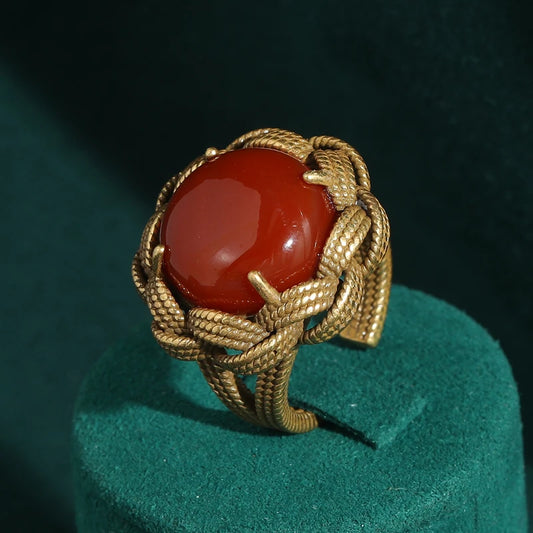 Women Vintage Gold Color Red Agate Stone Round Natural Antique Weave Ring