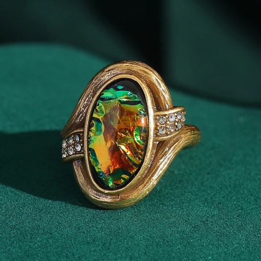 Vintage Abalone Shell Opal Oval Antique Gold Color Women Wedding Colorful Rhinestones Ring