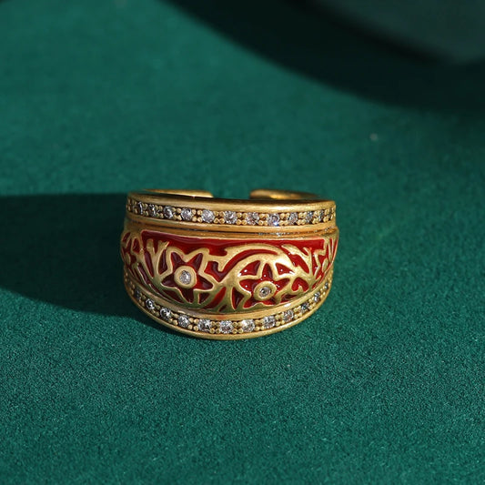 18K Gold-Plated Women Hand-Carved Floral Enamel Vintage Art Deco Ring