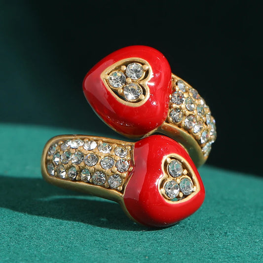 Women Rhinestone Open Antique Gold Color Vintage Red Heart Bohemian Rings