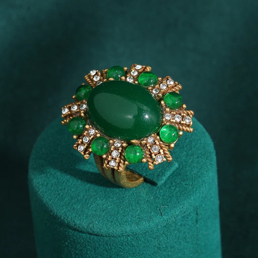 Women Vintage Antique Gold Color Oval Crystal Emerald Round Natural Stone Rings