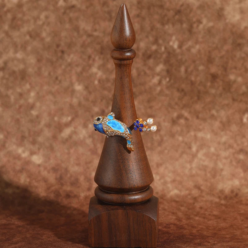 Vintage Blue Enamel Goldfish Pearl Rhinestone Women Open Gold Plated Designer Ring