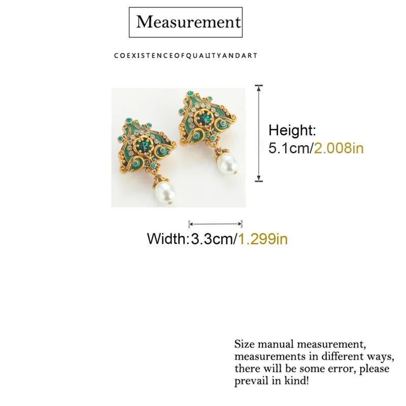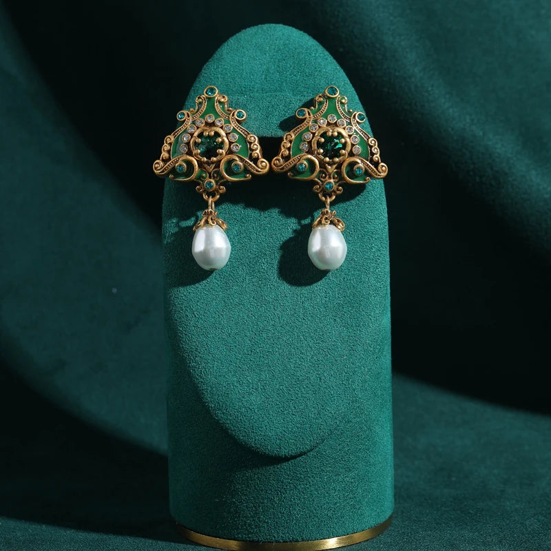 Vintage Pearl Triangle Green Flame Enamel Freshwater Wedding Pendant Earrings