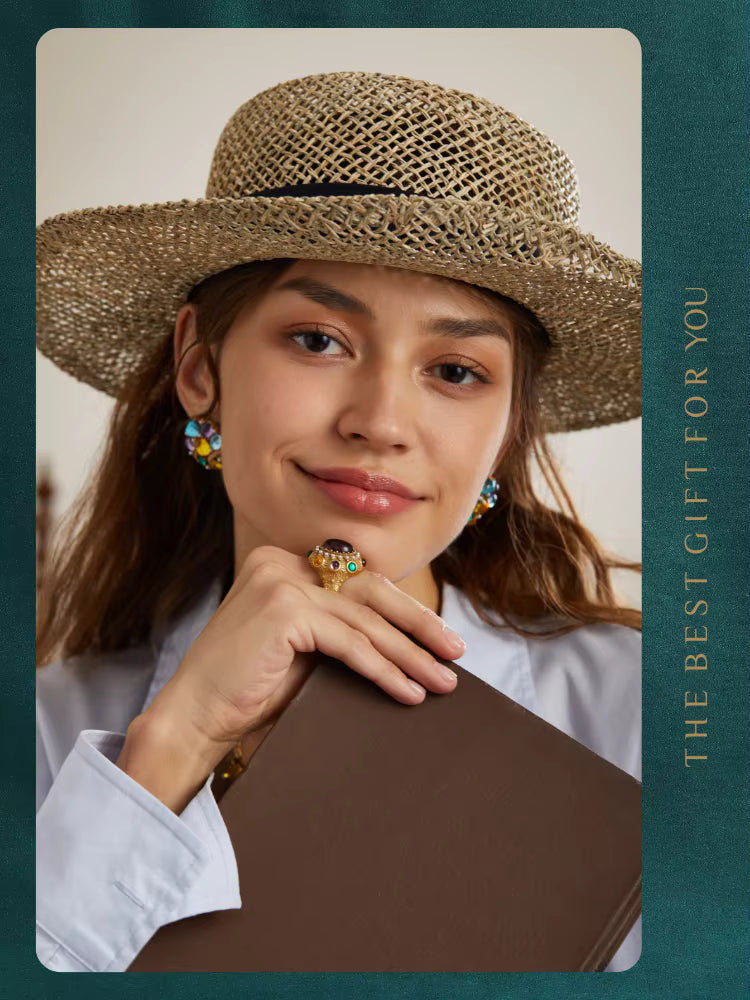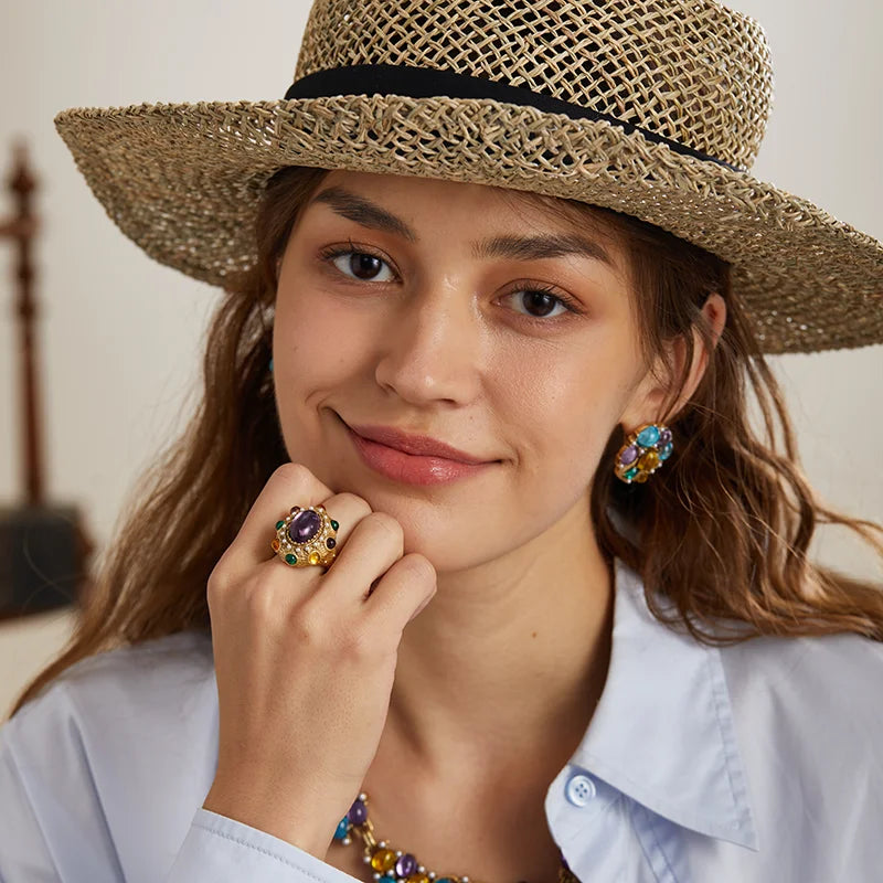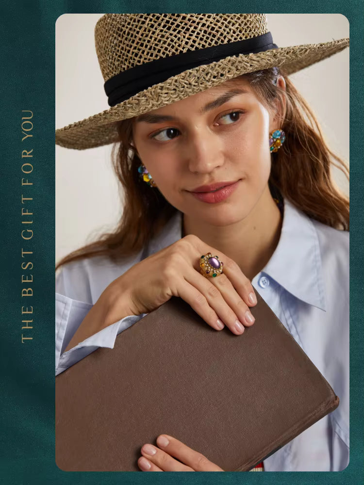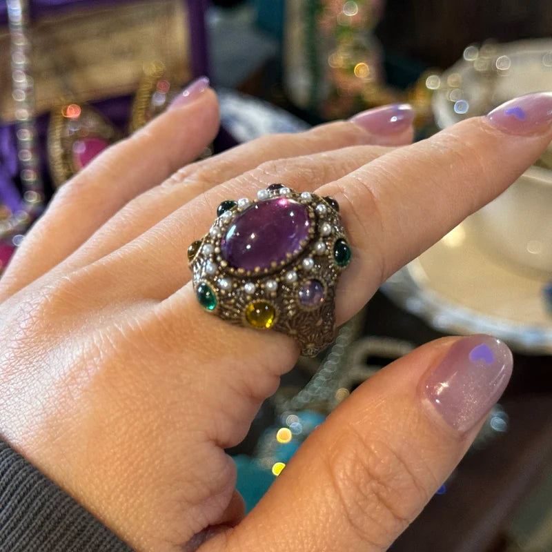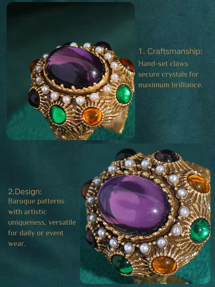 ❤[Description] 18K Gold-Plated & Copper ring with oval central stone, claw-set craftsmanship, and a blend of amethyst, emerald, citrine crystals, and pearls. Retro-baroque design for evening events or weddings.