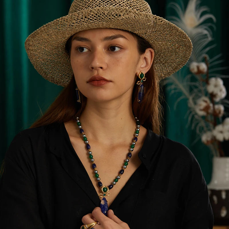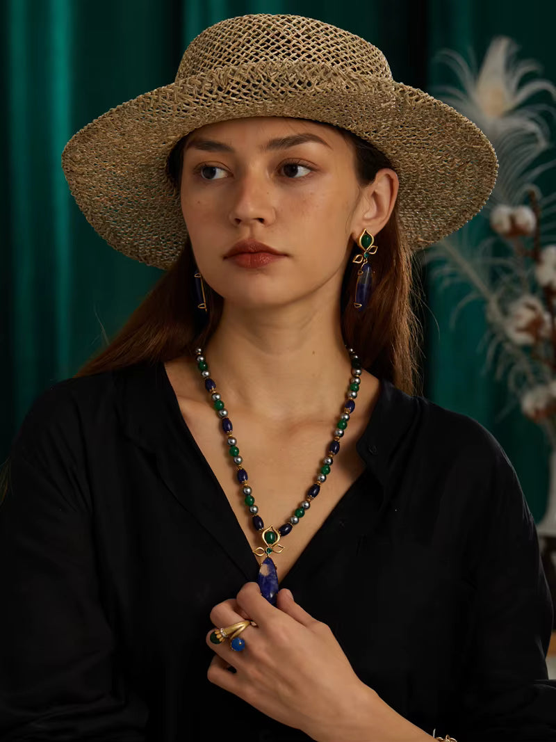 Women Long Blue Natural Stone Vintage Beaded Chain Pearl Designer Pendant Necklaces