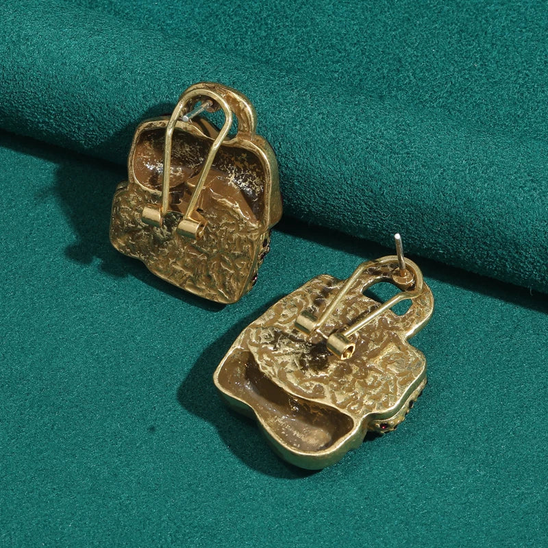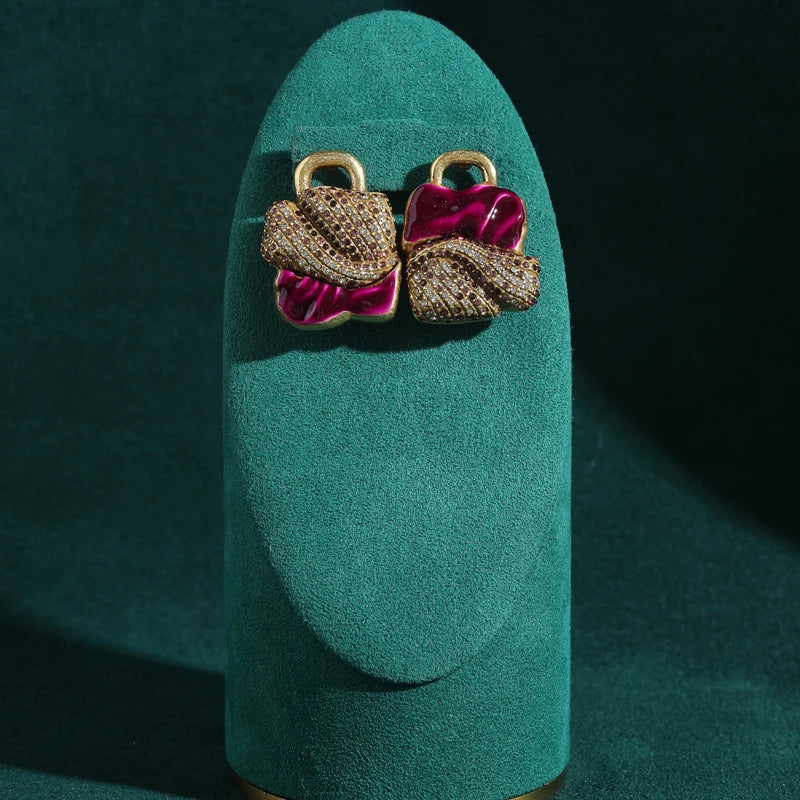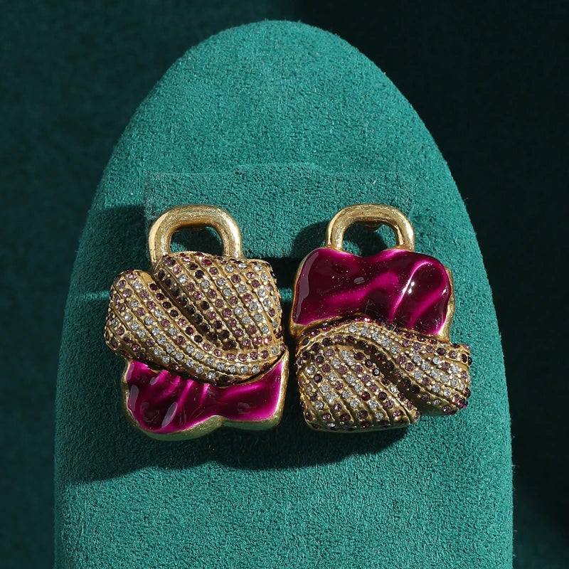 Women Purple Handbag w/ Asymmetrical Rhinestones Inlay Gold Color Earrings