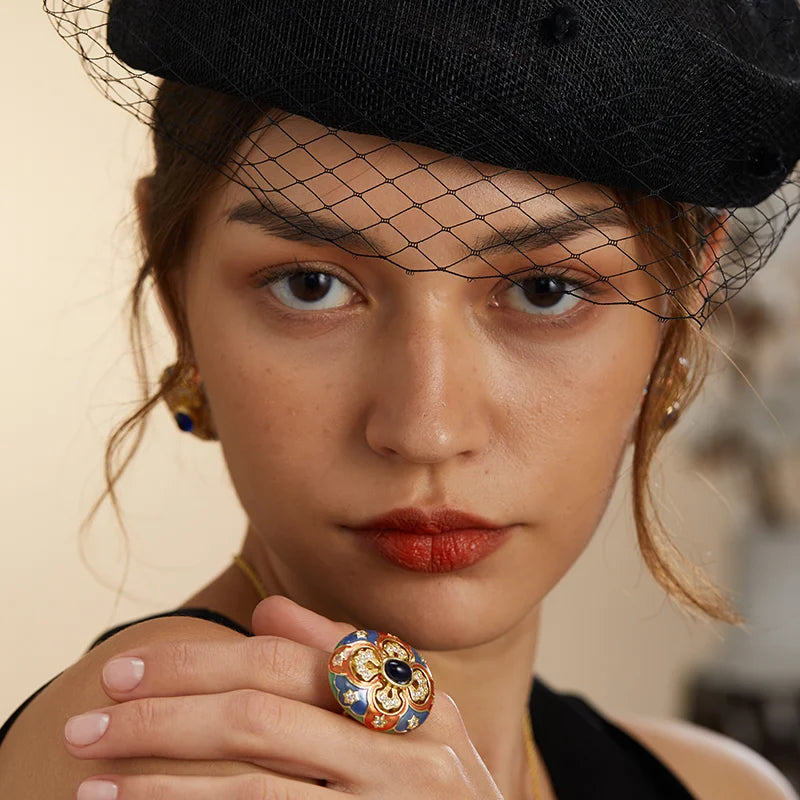 Women Vintage Enamel Adjustable 18K Gold Plated Floral Gemstone Ring